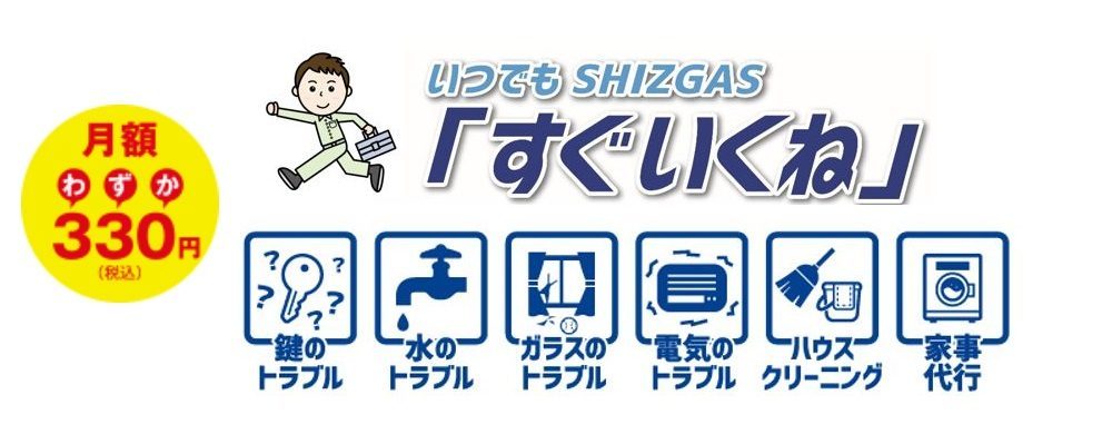 月額330円(税込)で、いざという時の「鍵・水まわり・ガラス・電気」のトラブルや「在宅確認」をサポートするサービス、”いつでもSHIZGAS「すぐいくね」”