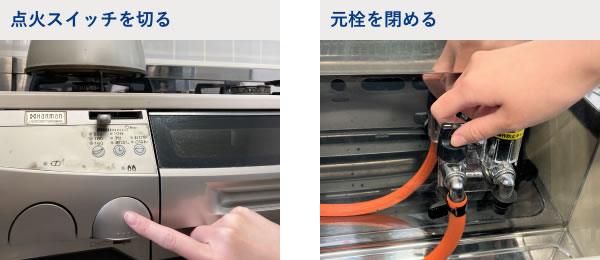 1. 器具の点火スイッチを切り、元栓を閉めてください。